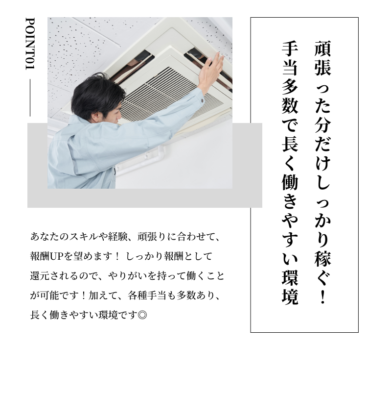 月給 20万円〜50万円 ※ 固定残業代30,000円 / 20hを含む。超過分は別途支給します。 ※ 日給制も選択可能です。 ★ 昇給あり(年1回) ★ 賞与あり(年1回・12月) └5月には年1回の決算賞与も支給します ☆ 国家資格手当: 30,000円 ☆ 通信手当: 3,000円 ☆ 配偶者手当: 10,000円 |