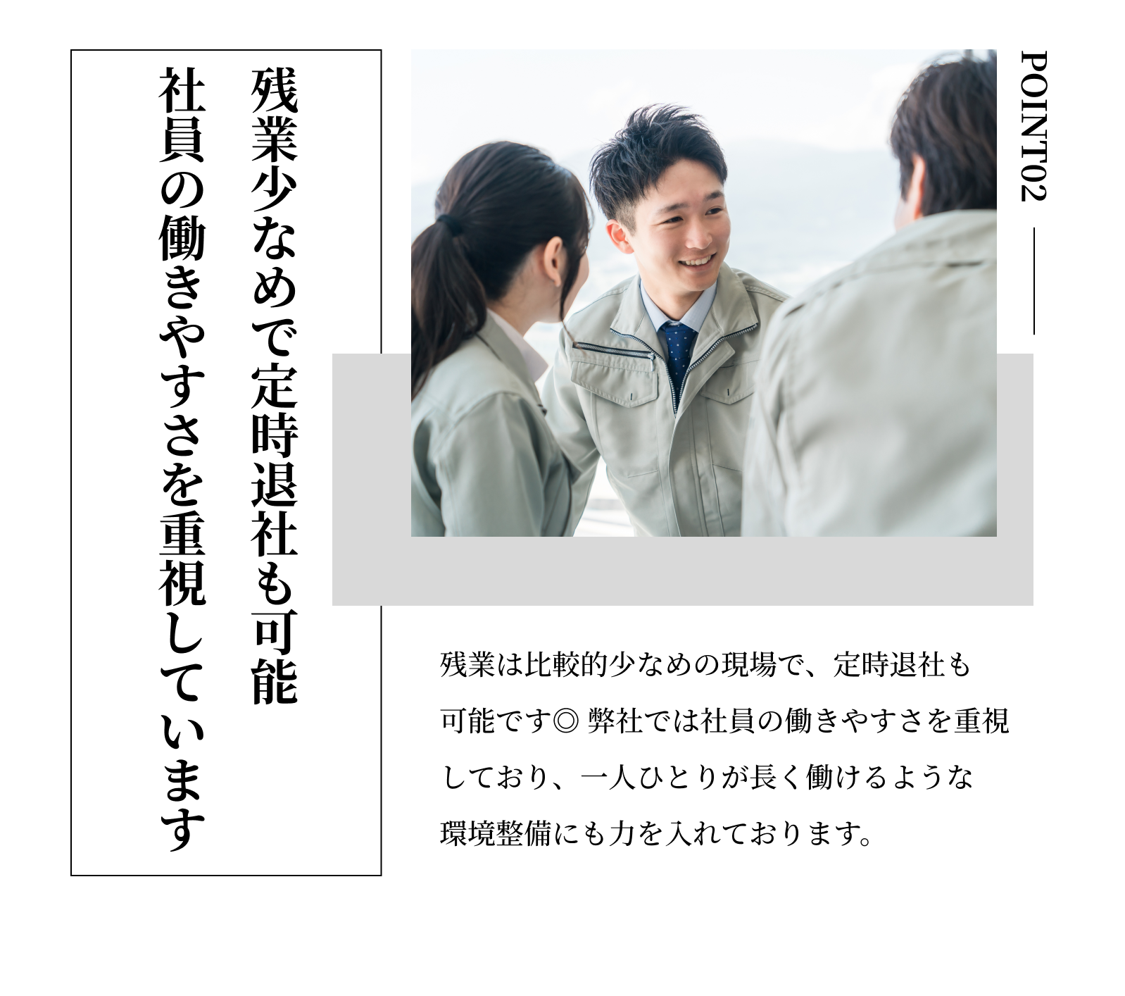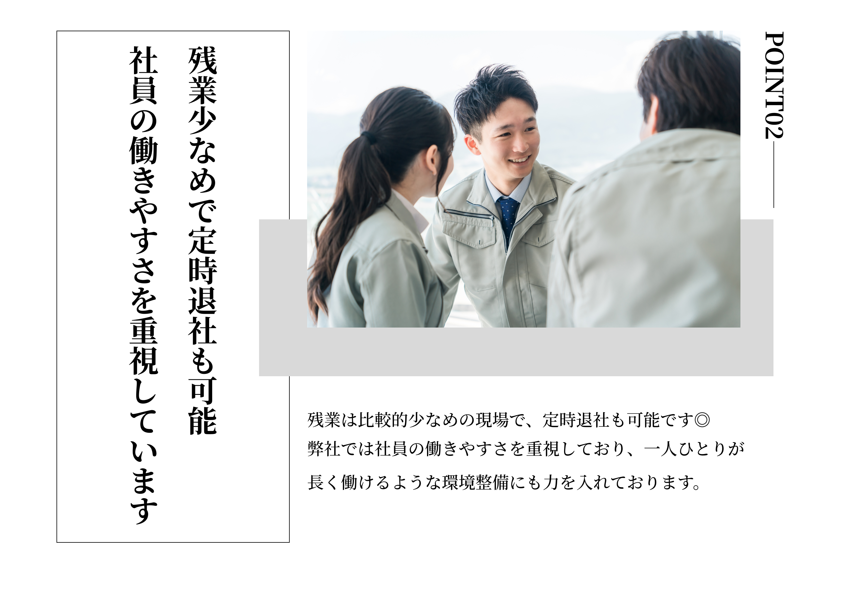 週休2日制(基本土日) └完全週休2日制に向け整備中です ※ 年間休日110日 ※ GW(5~6日間) ※ 夏季(最低3日間以上) ※ 年末年始(8日間) ※ 有給 ※ お休み調整可 |